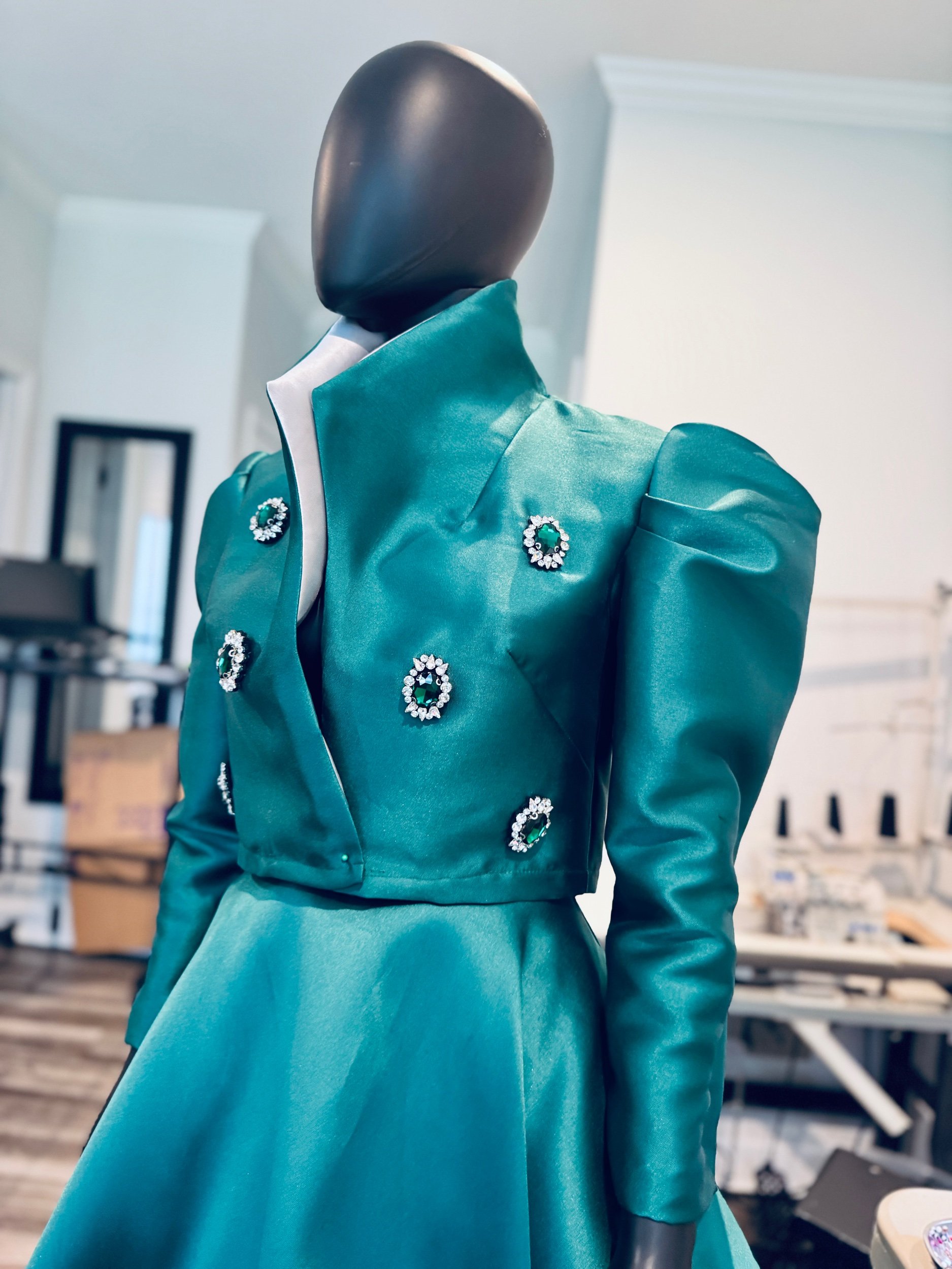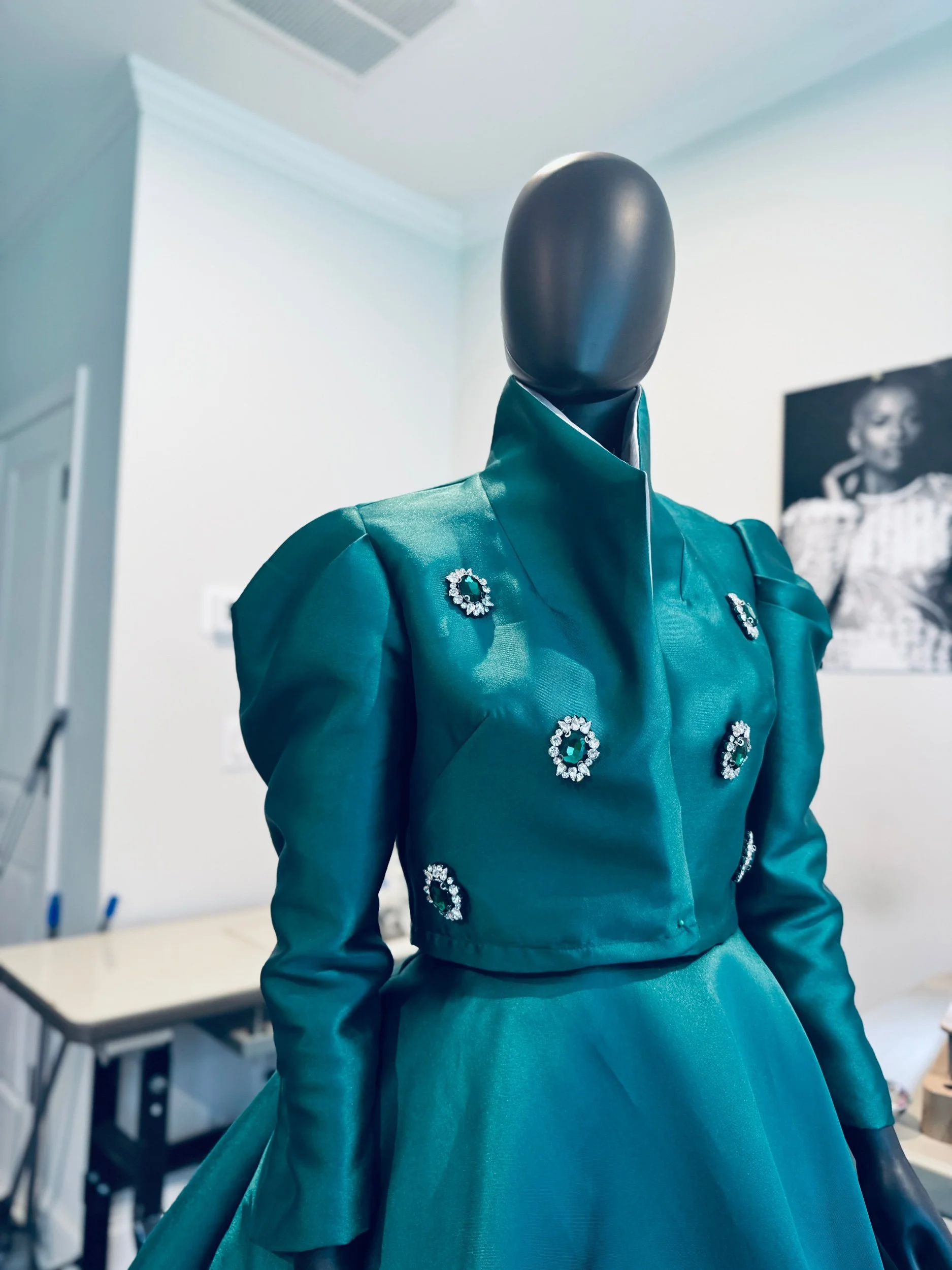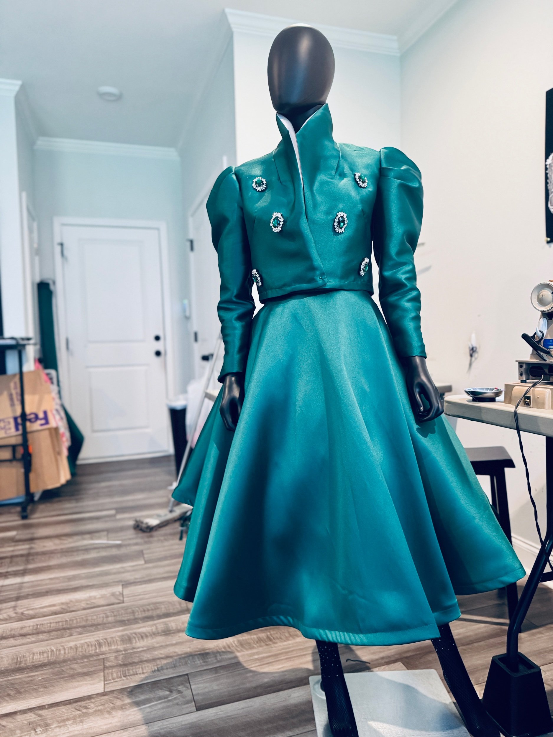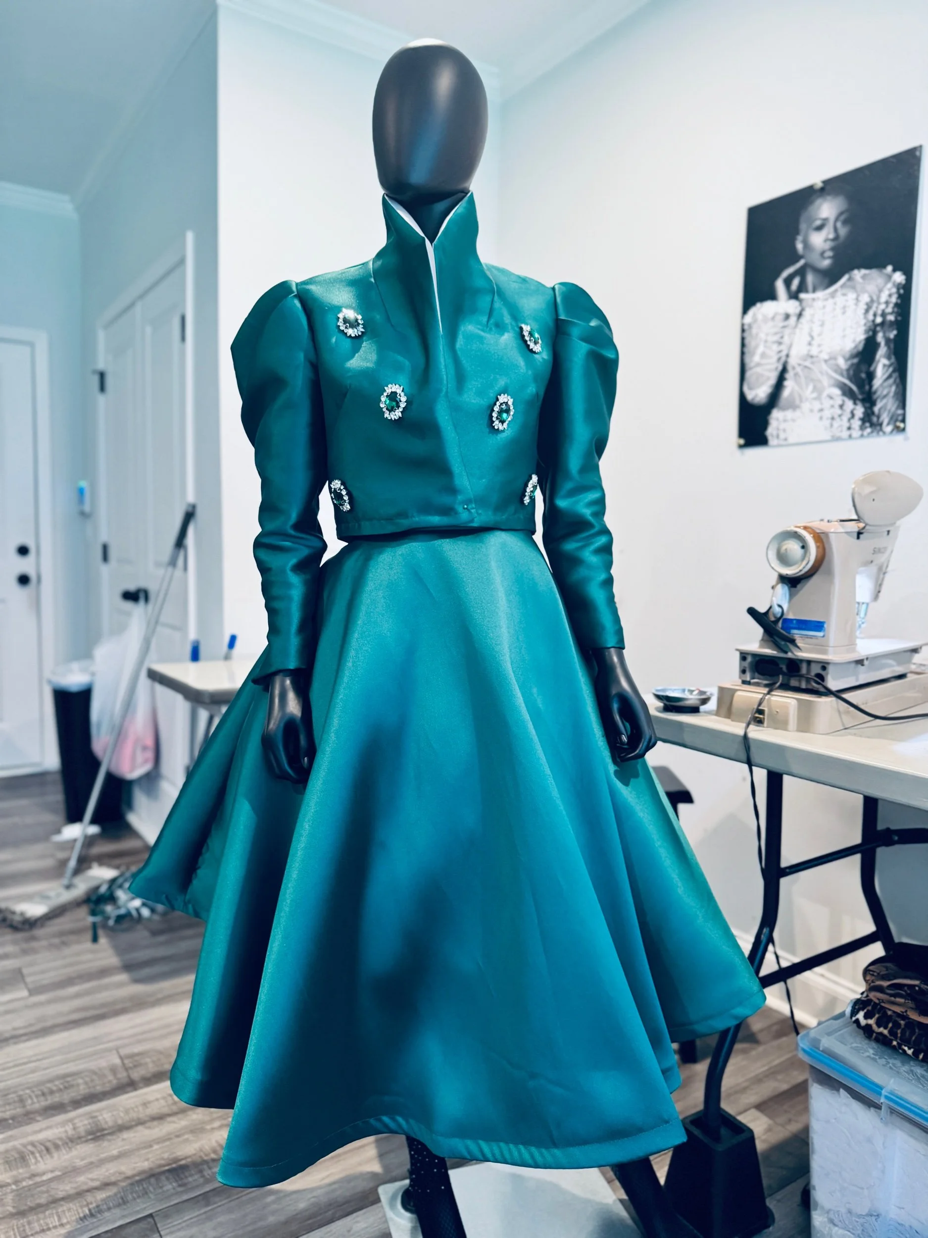 Handsewn from high-quality Mikado polyester fabric, it features seams, zippers, cuffs, and a neckline. Perfect for a special occasion